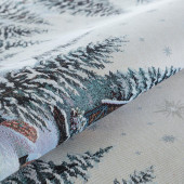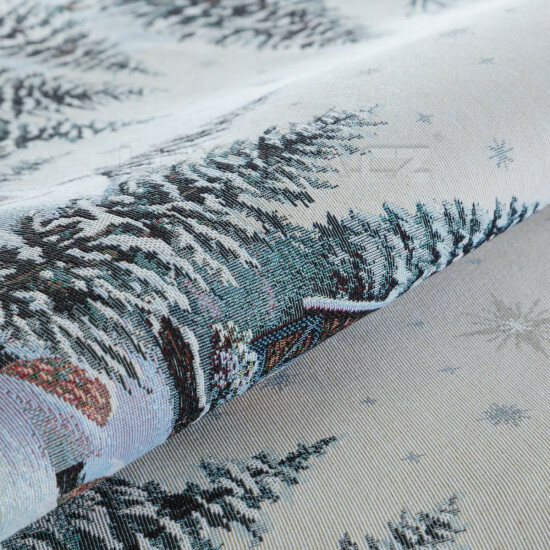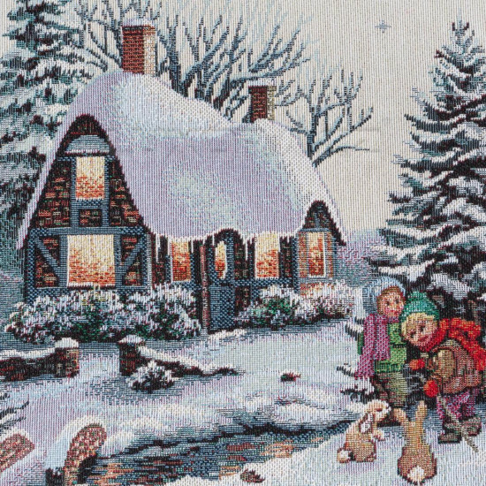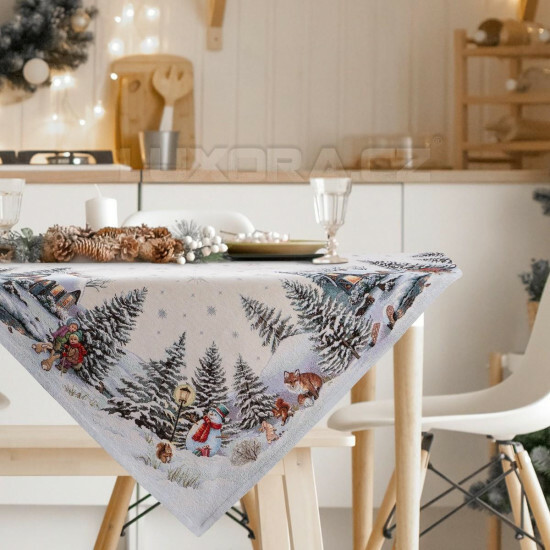 - Motiv obsahuje zimní krajinu s malebným zasněženým domečkem, obklopeným zasněženými stromy, a postavy dětí při zimních radovánkách. Střed ubrusu je laděn do jemného bílého tónu s motivy sněhových vloček, což vytváří svěží a klidný dojem.