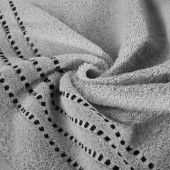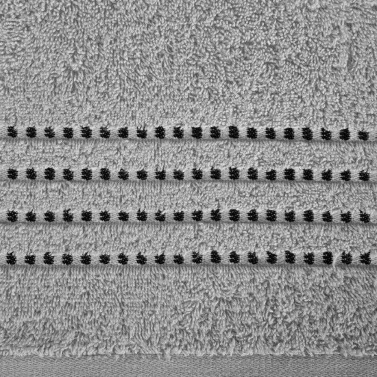 - Osušky a ručníky s výjimečnou měkkostí a savostí v šedém odstínu zdobené ve spodní části proužky šedočerné barvy.