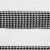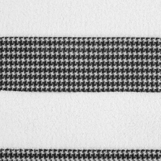 - Vysoce savé a jemné osušky a ručníky bílé barvy, které lemuje vzor tmavěšedo-bílého pepita. Ve stejném vzoru je i ozdobná bordura v dolní části osušek a ručníků.