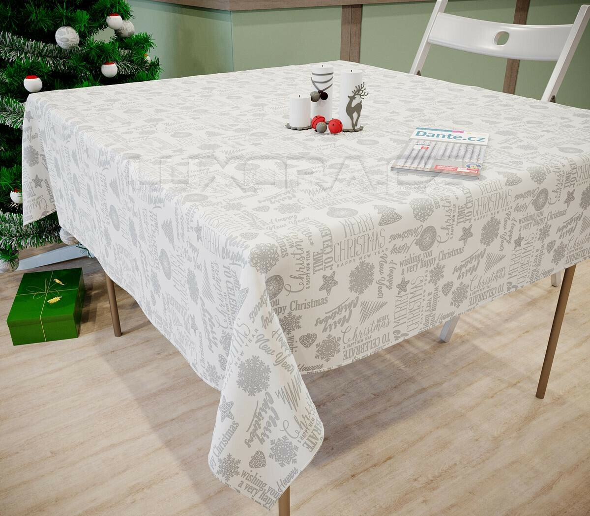 - Bílý ubrus s moderním motivem vánočních ozdob, vloček a anglických nápisů v šedivé barvě.