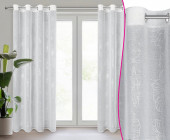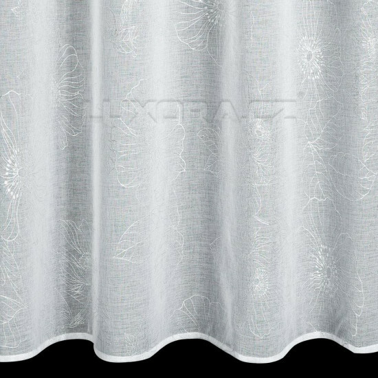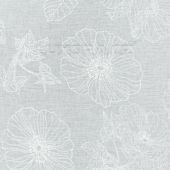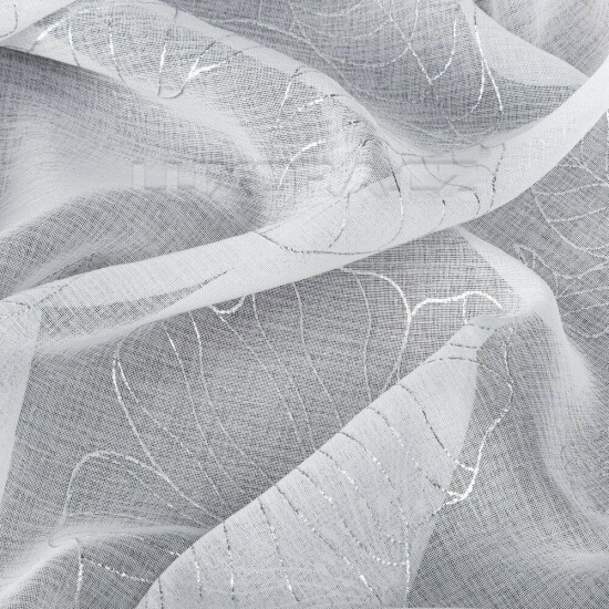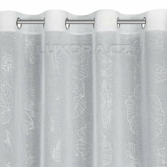- Elegantní bílá záclona s jemnou strukturou zdobená decentním stříbrným potiskem květin a listů.